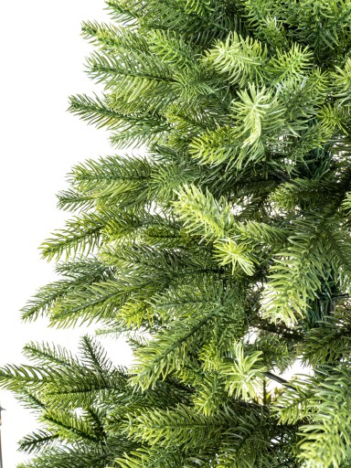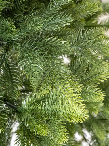 Choinka wykonana jest w 100% z gałązek z tworzywa sztucznego PE o barwie, która doskonale odtwarza rzeczywiste kolory natury.