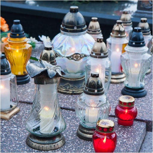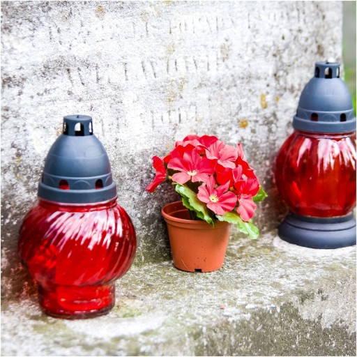 Znicz zawiera blaszany dekielek w kolorze złotym, który chroni płomień przed wiatrem lub deszczem. Szkło znicza w kolorze czerwonym świetnie rozprasza światło palącego się wkładu.