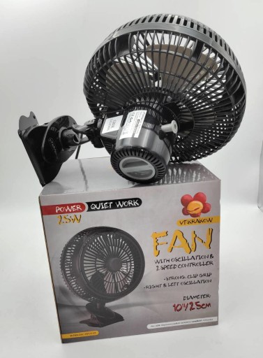 VF KRAKOW 25W FAT FAN to najwyższej jakości wentylator mieszający szerokiego zastosowania. Wentylator wykonuje ruch oscylacyjny (obraca się) dzięki czemu powietrze w namiocie jest idealnie wymieszane. Dodatkowo, aby zwiększyć skuteczność mieszania, zastosowano pasywnie poruszaną tarczę przednią. Obraca się ona przy pomocy pędu powietrza. PROFAN posiada dwa rodzaje klipsów montażowych, które umożliwiają jego bezproblemowy montaż w dowolnie wybranym miejscu oraz płynną regulację głowicy w pionie i poziomie.