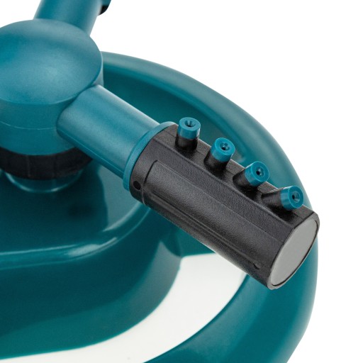 Zraszacz posiada stabilną konstrukcję, którą umieszcza się bezpośrednio na ziemi bez konieczności wbijania. Dodatkowo za pomocą obracanych końcówek możliwa jest regulacja obszaru działania i odległości podlewania.
