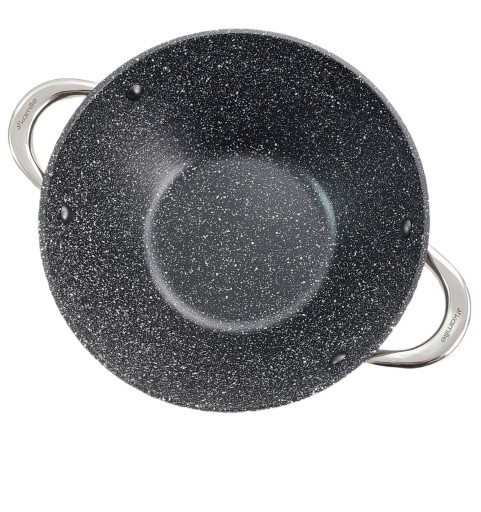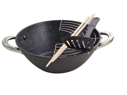 Okrągły, masywny wok Kamille wykonany ze stopu żeliwa, pozwoli Ci na sprawne przygotowanie ulubionego dania. Jest to wok kantoński, służący do smażenia w ruchu, szybkiego przyrządzania potraw na ogniu. Przygotowane w ten sposób dania zachowują swój oryginalny, orientalny smak i aromat, nie tracąc swojej soczystości. Wok dodatkowo został wyposażony w grillowy ruszt ze stali nierdzewnej, funkcję aromat, teflonową łopatkę i drewniane pałeczki