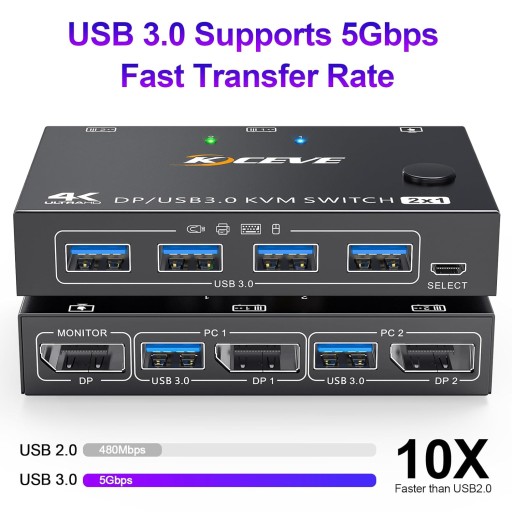- Przełącznik USB DisplayPort z 4 portami USB 3.0 - przełącznik KVM DisplayPort 1.4 z 4 wbudowanymi portami USB 3.0, 2 PC dzielą 1 wyświetlacz i 4 urządzenia USB 3.0, bez konieczności wyciągania wtyczki, identyfikuj bezprzewodowe klawiatury, myszy, drukarki, skanery i inne urządzenia USB (nie obsługuje myszy Bluetooth). USB 3.0 obsługuje wydajność 5 Gb/s i jest kompatybilny z urządzeniami USB 2.0/1.1. Oszczędzaj miejsce biurku i spraw, aby Twoja praca była łatwiejsza i wydajniejsza.