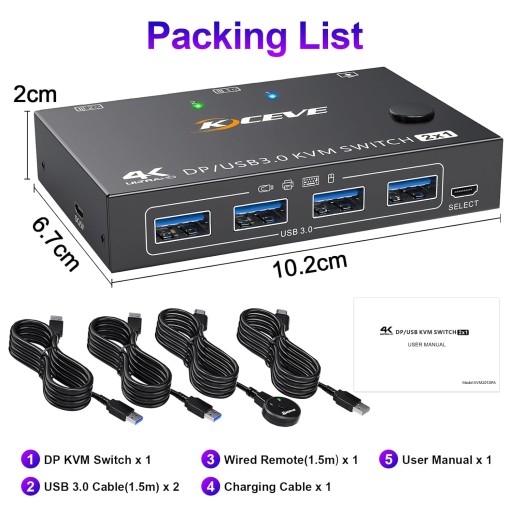- Przełącznik DP-KVM z 2 metodami przełączania - Plug and Play, nie wymaga dodatkowego oprogramowania sterownika. Swobodne przełączanie pomiędzy 2 komputerami, 1 monitorem poprzez ciśnięcie przycisku panelu sterowania lub przewodowy pilot zdalnego sterowania o długości 1,5 m. Diody LED pokazują, który komputer jest aktywny. Przełącznik USB DisplayPort z zasilaniem prądem stałym 5 V. Jeśli Twój komputer nie ma wyjścia DisplayPort, do użytku z tym przełącznikiem KVM preferowany jest adapter USB C DP lub MINI-DP DP