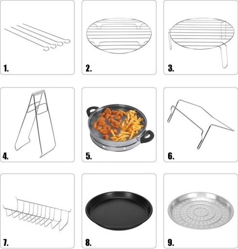 - 5. Pierścień ze stali nierdzewnej umożliwia powiększenie litrażu piekarnika z 12 do 17 litrów. Siatka umieszczona na pierścieniu umożliwia smażenie pod wpływem wysokiej temperatury. Idealna np. do frytek, mięsa itd.