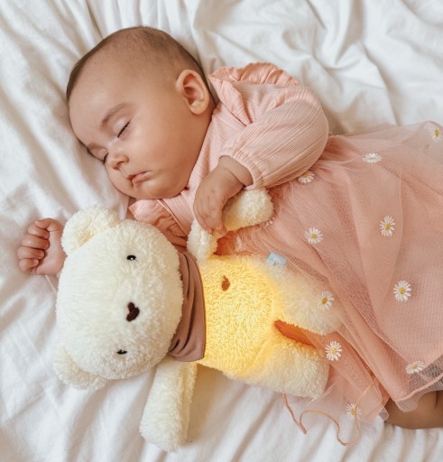Lampka umieszczona w Misiu Szumisiu rozświetla delikatnie jego brzuszek, emitując nastrojową i kojącą poświatę. To światełko tworzy przytulną atmosferę w pokoju dziecka i pomaga maluszkom szybciej zasnąć, zwłaszcza jeśli nie lubią one spać w ciemności.