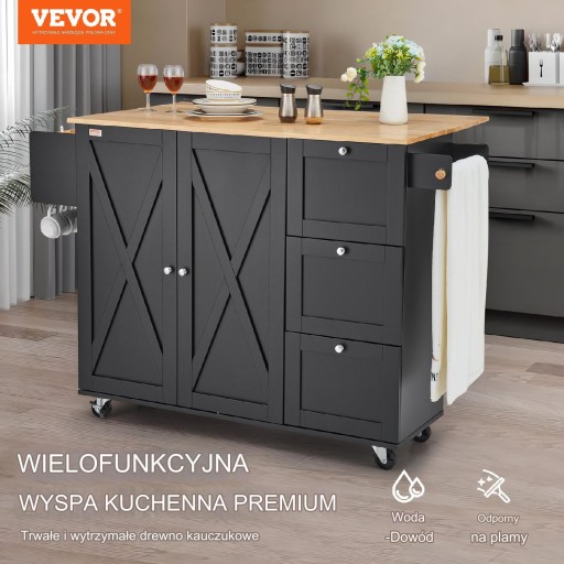 Mobilna wyspa kuchenna posiada blat wykonany z wysokiej jakości litego drewna kauczukowego i płyty MDF, dzięki czemu powierzchnia jest odporna na plamy, wodoodporna, wytrzymała i trwała.