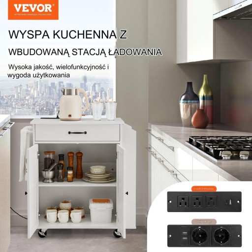 Ta wyspa kuchenna zapewnia dodatkowe miejsce na kulinarne kreacje. Zawiera listwę zasilającą z 3 gniazdami i długim przewodem zasilającym, dzięki czemu można wygodnie ładować różne urządzenia kuchenne.