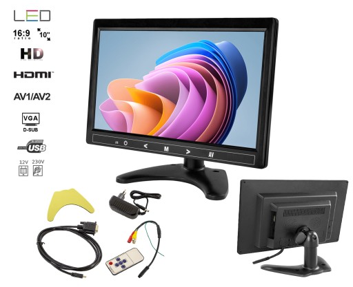• matryca LCD 10.1 cali Hi-Contrast • format: 16:9 • jasność 200 cd/m2 • kontrast 800:1 • rozdzielczość HD 1024x600 • tryb HDMI: 480i, 720i, 1080i, 1080p • funkcja obracania obrazu tylko w trybie VGA • systemy: PAL/NTSC • wejście HDMI • wejście VGA • wejście AV • pobór mocy: 12W • zasilanie: 230V (możliwość dokupienia zasilacza 12V) • wymiary: szer. 255mm x wys. 160mm x gr. 9mm (22mm) • waga: ok. 800 g • kolor: czarny • w zestawie: - monitor, - pilot, - podstawka, - kabel USB - VGA, - kabel jack - AV, - zasilacz 230V