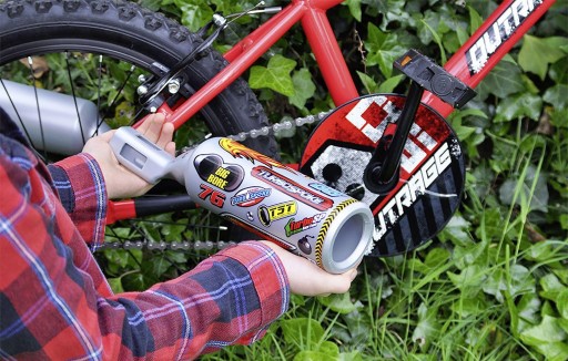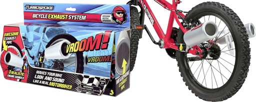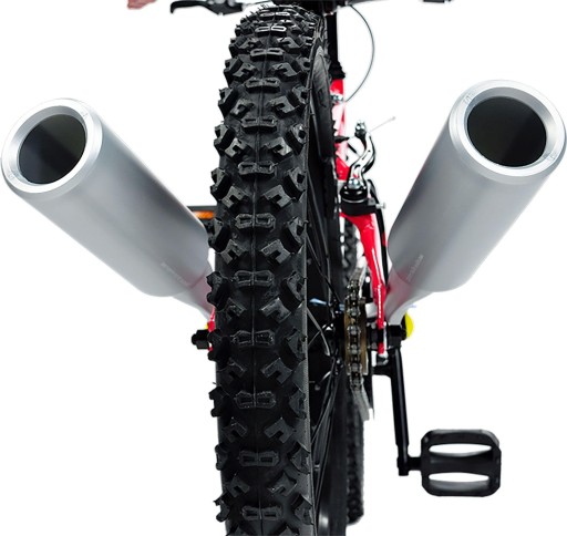 Turbospoke nie tylko wygląda jak prawdziwy wydech motocykla, ale jego część powoduje nawet naprawdę fajny hałas silnika. Gdy tylko koła się zakręcą, wydech wydobywa dźwięk, który chcesz usłyszeć, i zmienia się w zależności od prędkości. Przykład: Nie potrzebujesz baterii do Turbospoke. Jest w 100% zasilany siłą mięśni.