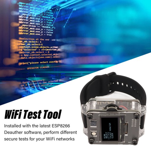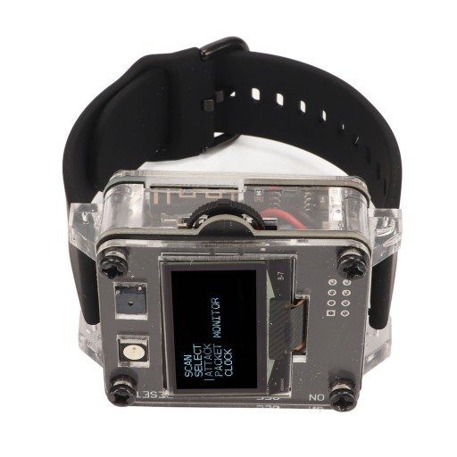 Item Type: WiFi Deauther Watch Material: ABS Weight: Approx. 114g / 4.0oz Authentication Attack: Disconnect 2.4G WiFi Deauth Beacon: Create a Fake Network Deauther Detector: Confusion WiFi Tracking Packet Monitor: Display WiFi Traffic GOIOS and Hardware Information: Display: SH1106 1.3 Inch Organic Light Emitting Diode Display SDA: GPIO 5 Display SCL/SCK: GPIO 4 WS2812b LED: GPIO 15 Button Up: GPIO 12 Button Pressed: GPIO 13 Button selection: GPIO 14 Side Button: RST Built in Polymer Lithium Battery: 500mAh