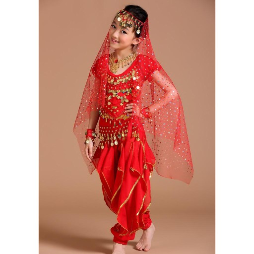 Kostium do tańca brzucha dla dzieci Moneta Top z frędzlami Harem Pant Hip Scarf Red