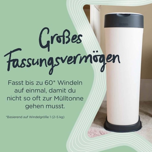 Ze względu na swój rozmiar, pojemnik na pieluchy XL mieści do 50 pieluch jednocześnie (dot. pieluch w rozmiarze 1, 2-5 kg) i oszczędza Ci częstych wypraw do kosza.
