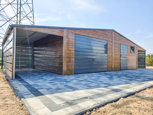 Garaż blaszany z wiatą 9x6m Matowa Czerń + Dąb rustykalny +furtka