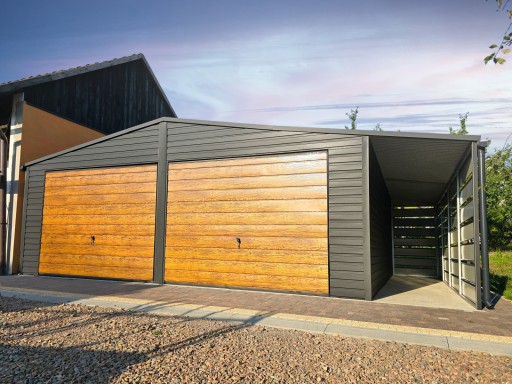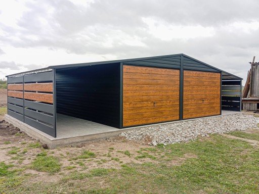 Garaż blaszany z pomieszczeniem gospodarczym i wiatami 12x5m, konstrukcja na profilach ocynkowanych