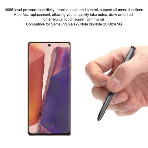 1、High?quality pen, before shipping, check the appearance/touch/color/function carefully to make sure good quality. 2、4096?level pressure sensitivity, precise touch and control, support all menu functions. 3、A perfect replacement, allowing you to quickly take notes, draw or edit all other typical touch screen commands. 4、Can't use pen to control bluetooth functions, such as taking photos of mobile phones. 5、Compatible for Samsung Galaxy Note 20/Note 20 Ultra 5G phone, high performance, well fit.