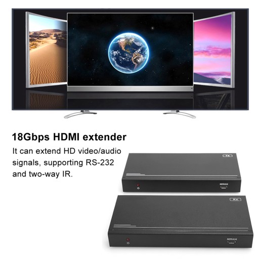 1、18Gbps HDMI extender, which can extend HD video/audio signals, supporting RS-232 and two-way IR. 2、The distance extended through a single CAT5e/6 cable is up to 394ft/120m (maximum for 492ft/150m with CAT6a/7 cable). 3、Support resolution up to 4K2K @60Hz 4:4:4, 18Gbps and HDCP 2.2 s, with an HDMI loop port for output. 4、It also supports de-embedding audio for L/R audio output and PoC function. 5、Designed with two-way IR pass-through function for easy control of signal source and display. 6、The transmitter is to capture HDMI input signal and transmit it over a Cat5e/6 cable, and transmit IR control signal. 7、The receiver is responsible for receiving HDMI signal and transmit IR control signal.