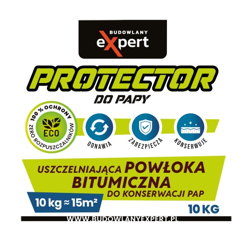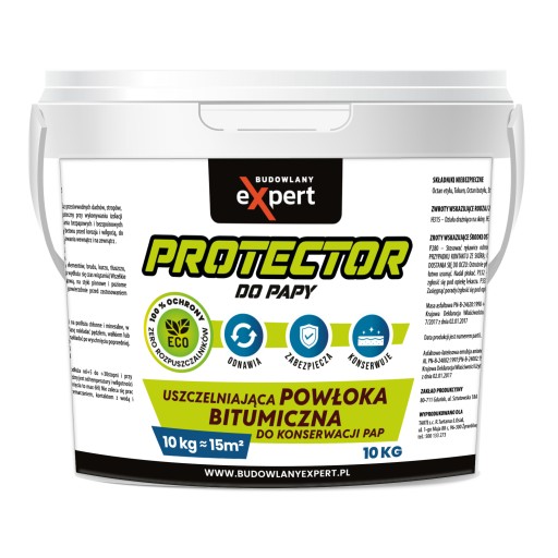 BUDOWLANY EXPERT Protektor do Papy to nowoczesny środek do tworzenia wodoszczelnych powierzchni do konserwacji i ochrony pokryć z papy. Dzięki nowoczesnym technologiom zapewnia trwałość, żywotność i wysoką odporność papy, nawet w ciężkich warunkach atmosferycznych. Tworzy powłokę, która chroni , wydłuża żywotność i zabezpiecza dach.