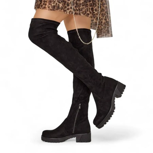 Długie damskie kozaki na grubszej podeszwie, cholewka wykonana z eko-zamszu. Buty są zapinane na suwak na wysokości kostki. Idealna baza do wielu jesiennych outfitów!