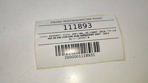 Przedmiot aukcji: OSŁONA PRZECIWSŁONECZNA DASZEK PRAWY PEUGEOT 308 I T7