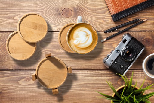 Przeznaczenie: pod kubek, szklankę, kieliszek | Kolor: bambusowy | W zestawie: 6 sztuk i stojak