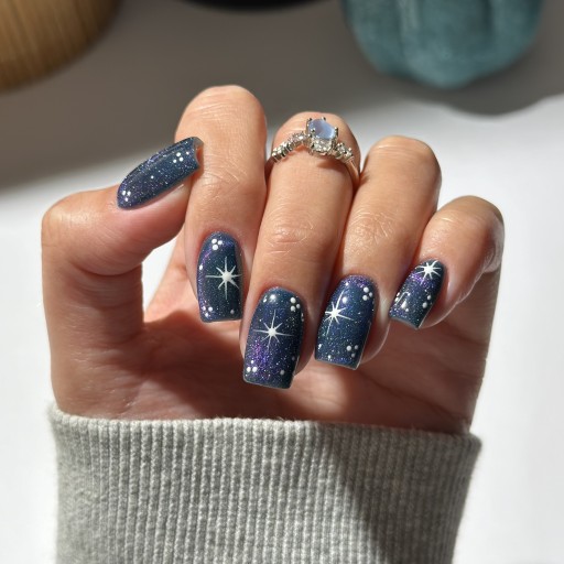 odcień, który przenosi manicure w świat futurystycznej elegancji, łącząc fioletowo-różowy galaktyczny pył z tajemniczą głębią morskiego błękitu. Jego półkryjąca baza tworzy efekt nieskończonej przestrzeni, a holograficzne refleksy migoczą niczym odległe gwiazdy, zmieniając się w zależności od kąta światła i stylizacji.