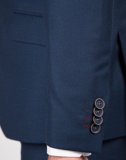 Projekt jednorzędowego garnituru łączy w sobie: proste klapy, skośną brustaszę, dwie kieszenie z ukośnymi patkami, oryginalne guziki, butonierkę obszytą czerwoną nicią, kołnierz od strony wewnętrznej podszyty filcem i dwa szlice z tył marynarki.