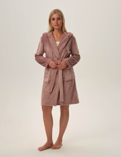 Szlafrok Frankie przyjemnie otuli Cię i zapewni ciepło w czasie chłodnych wieczorów. Wykonany z mięsistej dzianiny szlafrok zachwyci Cię swoją miękkością. Spodoba Ci się także piękny, kobiecy kolor oraz takie praktyczne rozwiązania jak: ułatwiający otulenie się pasek, kaptur oraz pojemne kieszenie. Szersze rękawy szlafroka Frankie zapewnią Ci wygodę. Umożliwiają też włożenie pod szlafrok dowolnej bluzki lub grubszej koszulki.