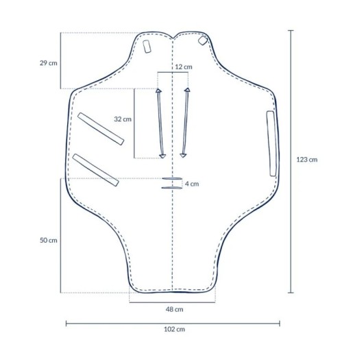 Kocyk ma 4 otwory na pasy bezpieczeństwa, bezuciskowy rzep, dzięki któremu kocyk nie będzie się przemieszczał oraz dwa rzepy.