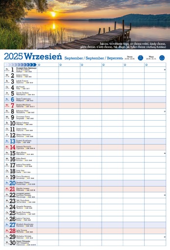 Zawiera imieniny, nazwy świąt, czas wschodu i zachodu Słońca, fazy Księżyca oraz znaki Zodiaku.