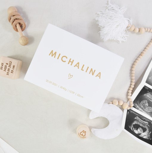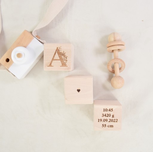 - Drewniana kostka z metryczką dziecka – Kostka z wygrawerowanymi danymi urodzenia dziecka, takimi jak data, godzina, waga i wzrost. To nie tylko piękny element zestawu, ale także wyjątkowa pamiątka, która przypomni o najważniejszym dniu w życiu Twojego dziecka.