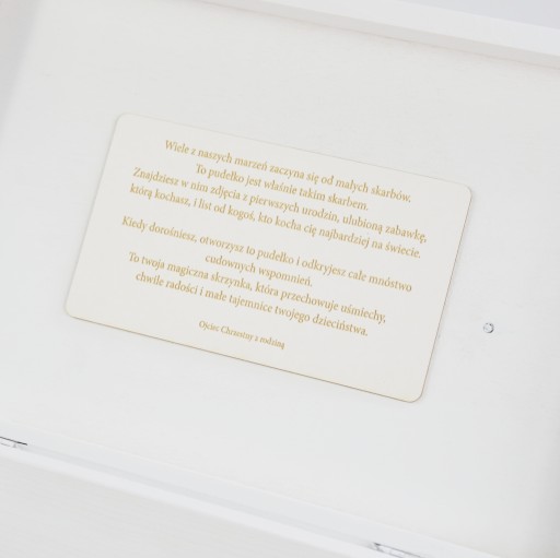 Aby nadać naszemu pudełku jeszcze bardziej wyjątkowego charakteru, umożliwiamy dodanie indywidualnej dedykacji na tabliczce wewnątrz pudełka. Możesz umieścić tam imię dziecka, datę urodzenia, życzenia czy nawet fragment ulubionego wiersza. Dzięki temu każde pudełko będzie unikalne i jedyne w swoim rodzaju.