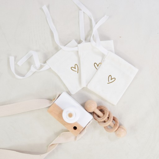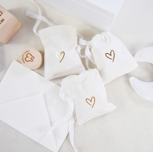 - Trzy welurowe woreczki – Delikatne, miękkie woreczki welurowe to idealne miejsce na przechowywanie drobnych pamiątek, takich jak pierwszy kosmyk włosów, opaska szpitalna czy inne ważne skarby z dzieciństwa Twojego maluszka. Woreczki są ozdobione złotym serduszkiem, co dodaje im elegancji.