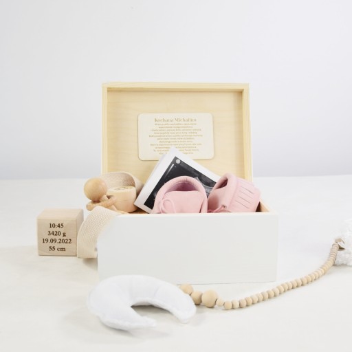Idealne miejsce na najważniejsze pamiątki – Wymiary pudełka (22x16x10 cm) są doskonałe, aby pomieścić najcenniejsze pamiątki z pierwszych lat życia maluszka. W środku możesz przechowywać takie skarby jak: