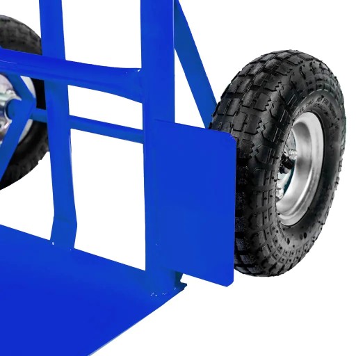 Wózek można wykorzystać na dwa sposoby: jako młynarkę na pompowanych kołach pneumatycznych bądź przekształcić ją w wózek magazynowy.