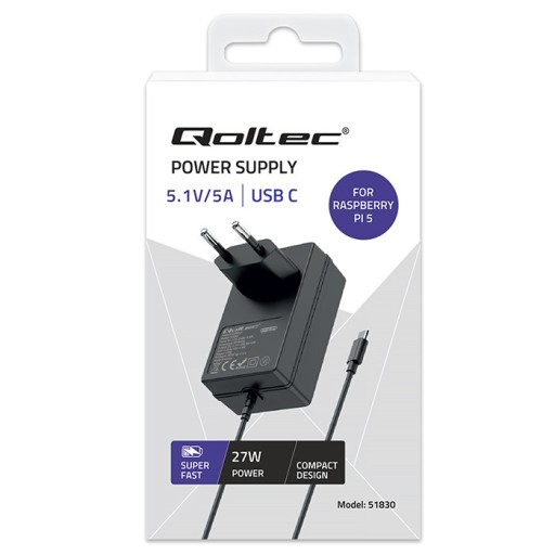 ✅ Qoltec Ładowarka Super FAST PD do Raspberry PI 5 | USB-C | 27W | 5.1V | 5A | Czarna