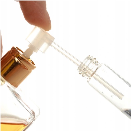Aby przelać ciecz z butelki z atomizerem do innego pojemnika, należy zdjąć główkę z atomizera i nałożyć końcówkę z rurką.