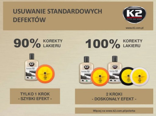 K2 LUSTER Q3 ZIELONY to pasta do maszynowego polerowania lakieru. Usuwa rysy po papierze ściernym, myjniach automatycznych, zmatowienia, skórkę pomarańczową, oksydację, hologramy, przebarwienia.