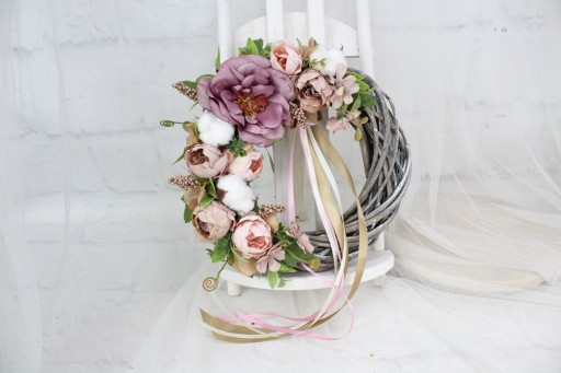 Jesienny wianek wiklinowy o średnicy 25cm udekorowany jesiennymi kwiatami w tonacji zgaszonego różu.