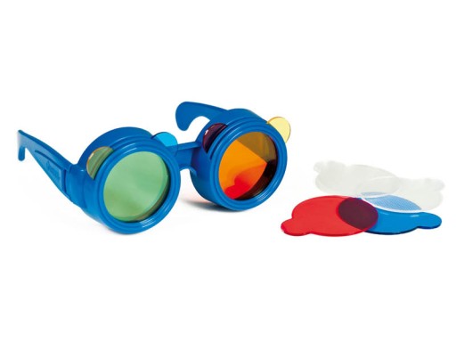 Okulary z wymiennymi szkłami. Można umieszczać dwa szkła w jednym okularze dzięki czemu dziecko może porównywać i mieszać barwy. Dodatkowo dołączone jest szkło zniekształcające, które daje efekt obrazu widzianego okiem owada.