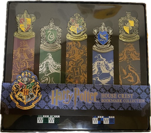 Ten zestaw zakładek do książek Hogwart idealnie nadaje się do przechowywania w książkach z amuletami i eliksirami. Zakładki wykonane w kolorach domu i szkoły mają plastikową klapkę, którą można umieścić na górze stron, a każda z nich jest zwieńczona odlewanym, ręcznie emaliowanym herbem szkoły lub domu. Zakładki znajdują się w czarnym pudełku upominkowym z logo Harry'ego Pottera.
