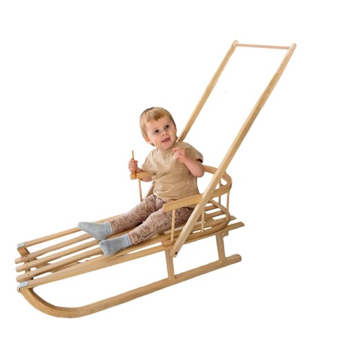 - Uniwersalne użytkowanie – W zestawie znajduje się sznurek do ciągnięcia oraz drewniana rączka do pchania, co pozwala na wybór formy prowadzenia sanek – dziecko może być ciągnięte lub pchane.