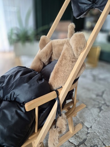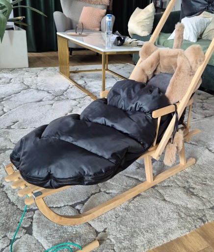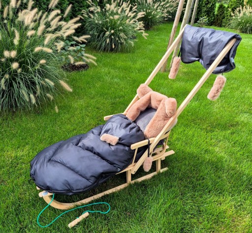 Oferujemy Państwu komplet drewniane sanki z oparciem ze śpiworkiem i mufkami .