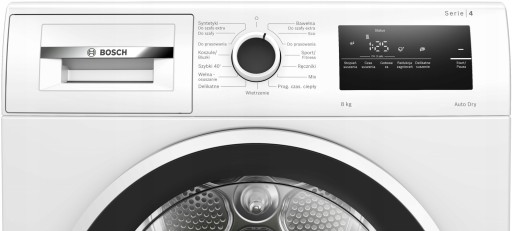 - Dodatkowe funkcje: Stopień suszenia, Czas suszenia, Redukcja zagnieceń, Delikatne suszenie, Start/Pauza