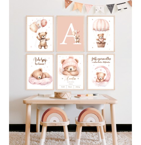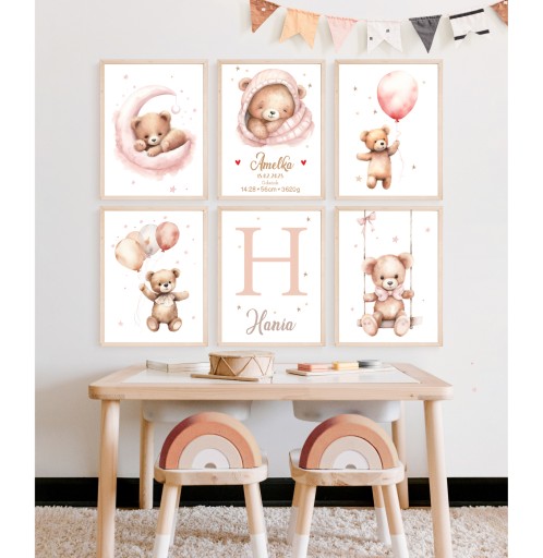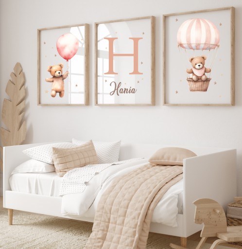 Zestaw 3 plakaty A4 misie z balonami róż dla dziewczynki imię metryczka Różne wzory