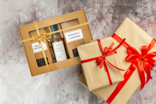 ZESTAW PREZENTOWY Z KAWĄ, SYROPEM DO KAWY ORAZ SŁODYCZAMI