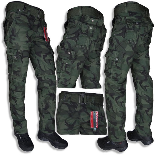 Spodnie Męskie Bojówki Zielone Moro z Paskiem Rozciągliwe (stretch)