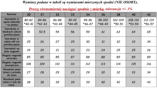 - Spodnie po przymierzeniu powinny być raczej "na ciasno" gdyż nowe spodnie mają tendencję do rozbijania (rozciągania) się po chwili używania o pół nawet do jednego rozmiaru.