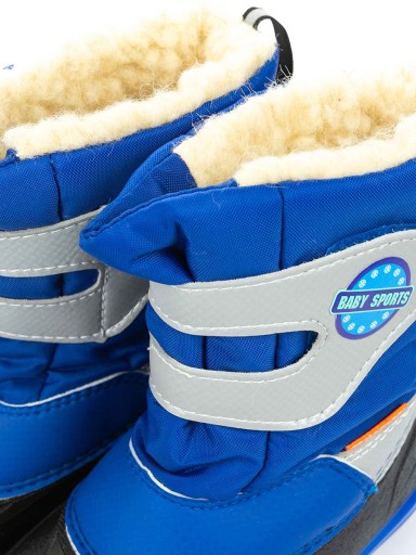 Chłopięce śniegowce idealne na zimowe szaleństwa na śniegu. Śniegowce są w kolorze niebieskim z szarymi i czarnymi wstawkami, więc będą fajnie pasować do każdego urwisa. Zapinane są na szeroki rzep, który ułatwi ich zakładanie i zdejmowanie. Skład: Cholewka - poliester / Podeszwa – termokauczuk / Ocieplenie - dzianina futerkowa