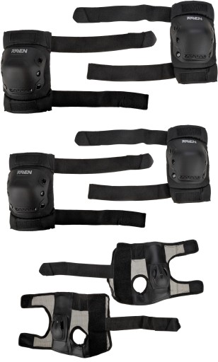 - Elastyczny materiałowy ściągacz w ochraniaczach na kolana i łokcie zapobiegający przesuwaniu się ochraniaczy pozwala na lepsze dopasowanie się do ciała i pozostanie na swoim miejscu, niż ochraniacze wyposażone wyłącznie w paski z rzepami