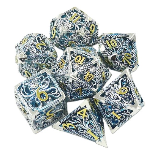 Zestaw siedmiu metalowych kości do gier fabularnych